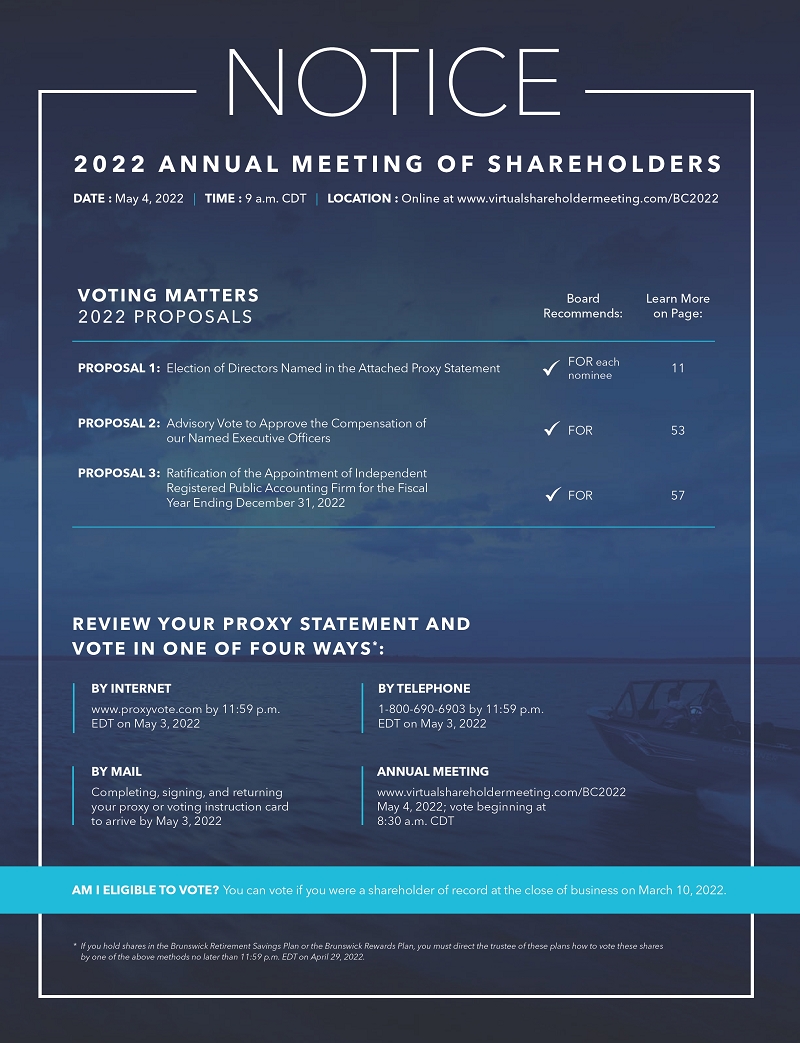 Brunswick will host our virtual Annual Meeting on Wednesday, May 4, 2022 beginning promptly at 9:00 a.m. CDT. There will be no physical location for shareholders to attend. A live audio webcast will be available to shareholders and the general public at www. virtualshareholdermeeting.com/BC2022. We encourage you to access the Annual Meeting prior to the start time. Online access will be available beginning at 8:30 a.m. CDT.