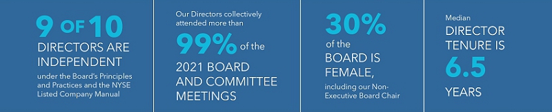 In 2021, we refreshed the Board of Directors, welcoming Directors Reginald Fils-Aimé, former president and chief operating officer at Nintendo of America, and MaryAnn Wright, former group vice president of Global Engineering and Product Development, Power Solutions at Johnson Controls International. At the Annual Meeting this year, Jane Warner will retire from the Board. We thank her for her valuable service to the Company since 2015 and wish her the very best in her future endeavors.