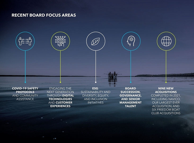 Our commitment to corporate responsibility remains strong through our Environmental, Social and Governance (ESG) programming. Brunswick has demonstrated a long-standing commitment to sustainability, and we recognize consumers rely on clean air and water to use and enjoy our products. Some of our major 2021 actions in support of this commitment included our investments in clean energy by signing a virtual power purchase agreement and installing more solar arrays at some of our facilities around the world, and also our investments in advanced manufacturing processes to reduce energy and water usage. Highlights of our sustainability programming are included in this proxy statement and further detail is available in our annual Sustainability Report. From a social perspective, we advanced our DEI programming and commitments this year with the launch of our TIDE: Together: Inclusion, Diversity, Equity program.