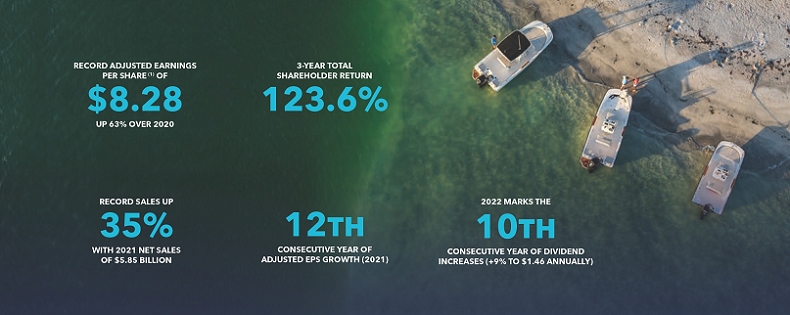 Brunswick delivered record financial and operational performance in 2021, despite headwinds brought on by the ongoing COVID-19 pandemic and a disrupted supply chain. Our success during the year not only showcases the strength and durability of our portfolio and earnings profile, but the perseverance of our more than 18,500 global employees who worked every day to ensure we prioritized the health and safety of all employees while continuing to achieve strong shareholder returns. We delivered our 12th consecutive year of adjusted EPS growth, with GAAP EPS of $7.59 and adjusted EPS of $8.28 (a 63% increase), and a net sales increase of 35% to $5.85 billion. These results were achieved while also posting record safety performance and earning recognition from Forbes as one of America’s Best Large Employers two years in a row (2021-2022).