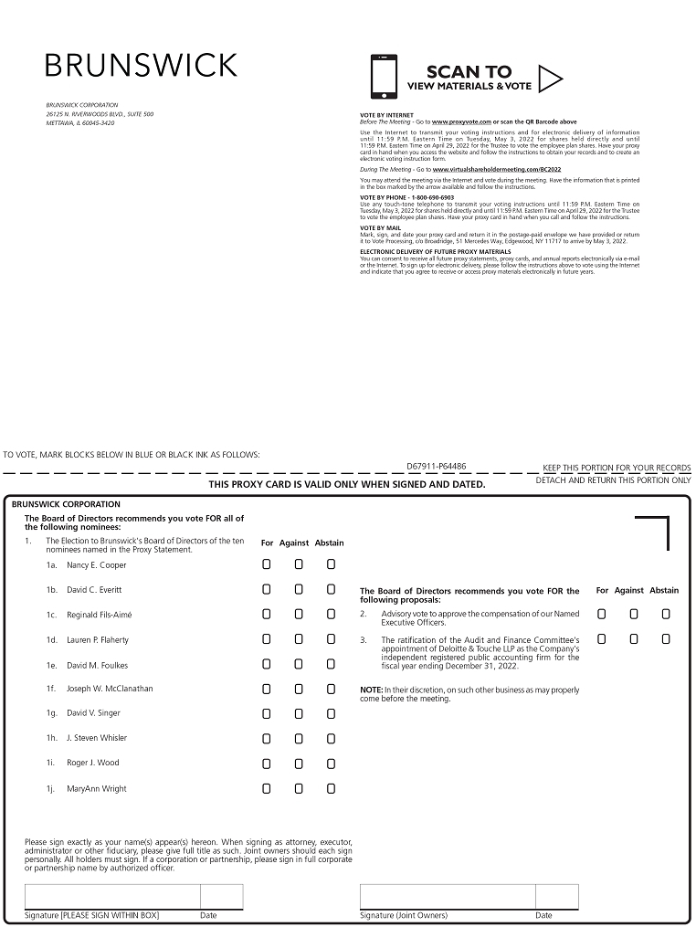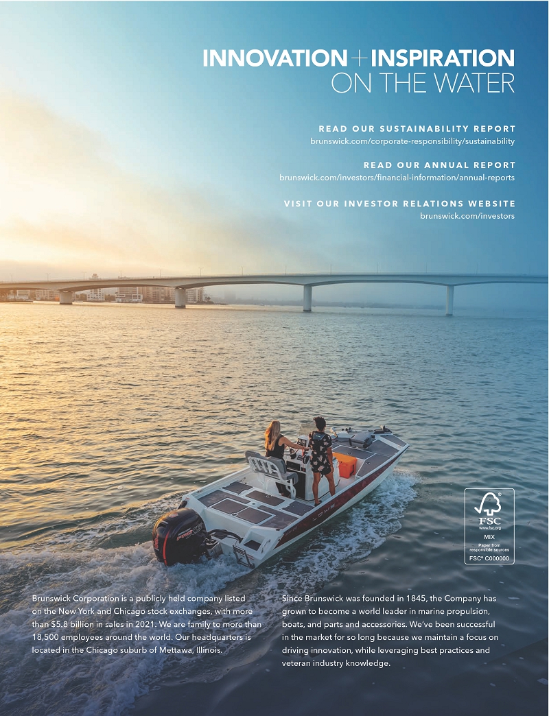 Brunswick will host our virtual Annual Meeting on Wednesday, May 4, 2022 beginning promptly at 9:00 a.m. CDT. There will be no physical location for shareholders to attend. A live audio webcast will be available to shareholders and the general public at www. virtualshareholdermeeting.com/BC2022. We encourage you to access the Annual Meeting prior to the start time. Online access will be available beginning at 8:30 a.m. CDT.