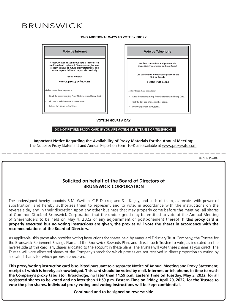 If you hold any shares in the Brunswick Retirement Savings Plan or the Brunswick Rewards Plan, you must direct the trustee of these plans how to vote these shares by following the instructions on your Notice for voting by telephone at 1-800-690-6903 or via the Internet at www.proxyvote.com, or by signing, dating, and mailing in a proxy card. The deadline for voting shares held in the Brunswick Retirement Savings Plan or the Brunswick Rewards Plan is 11:59 p.m. EDT on April 29, 2022. The trustee will vote these shares as you direct. The trustee will vote allocated shares of Common Stock for which proxies are not received in direct proportion to voting by allocated shares for which proxies are received.
